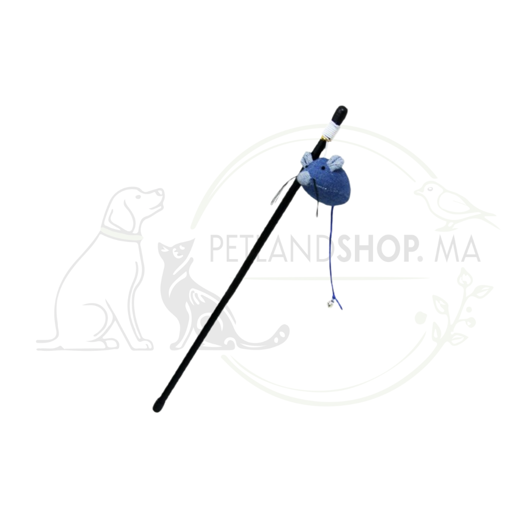 Canne à pêche Bubimex 8 cm avec souris et clochette en denim. Favorise le jeu interactif et stimule l’instinct de chasse des chats.