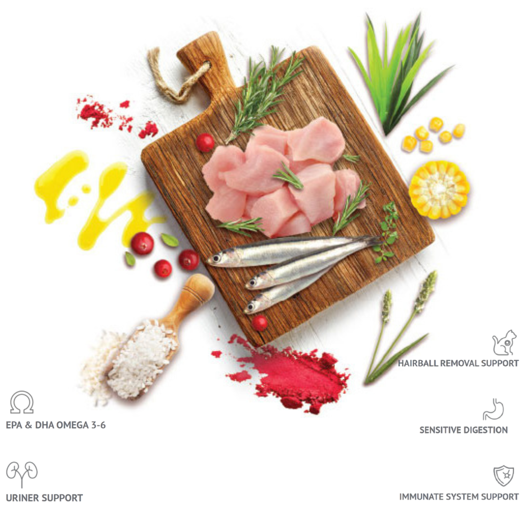 Alimentation complète pour chats adultes au poulet et aux anchois. Favorise une digestion équilibrée, une bonne vitalité et un pelage sain grâce à des protéines hautement digestibles et riches en nutriments essentiels.